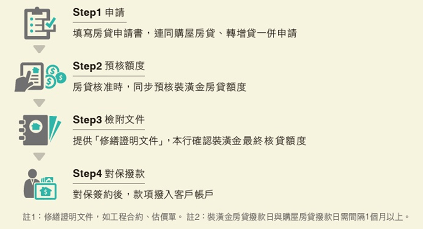 - 非本行房貸戶,裝潢資金可連同購屋房貸或轉增貸一併申請