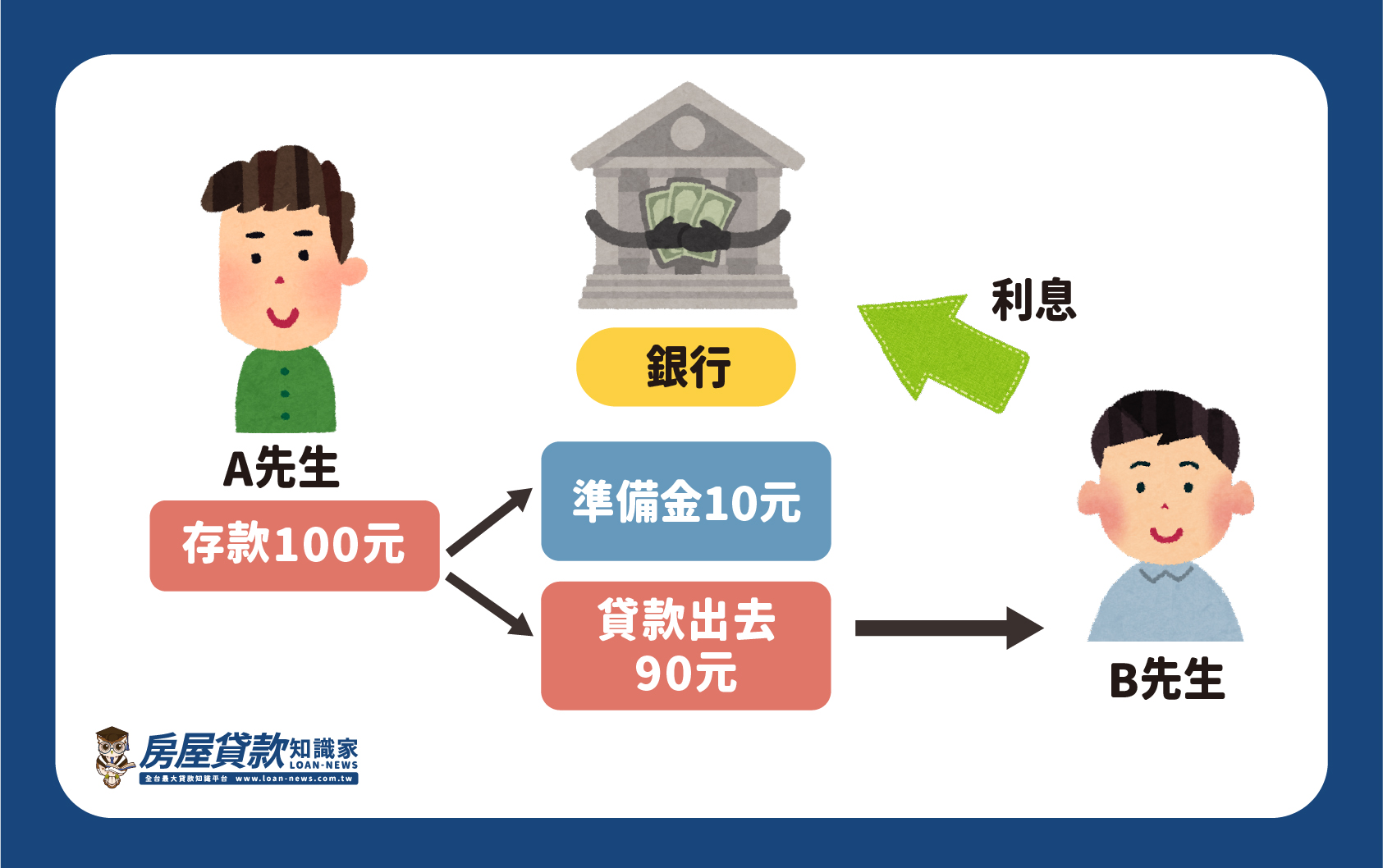 銀行的實際運作模式主要是利用貨幣乘數效應,藉由放款來賺取利息。假設A在銀行存了100元,根據法律規定,銀行可以在一定比例的範圍內運用這筆存款,創造出更高的報酬來支付存款的利息,即是所謂的準備金制度。因此A存了100元,銀行可留下10%的準備金(10元),再將剩下的90%(90元)貸款出去給B。根據貨幣乘數效應,銀行每貸款出去就可以不斷地創造新錢,用100元的存款去算,最終可得到1000元,這之中多出來的900元就是銀行透過貸款而生的放款利息。