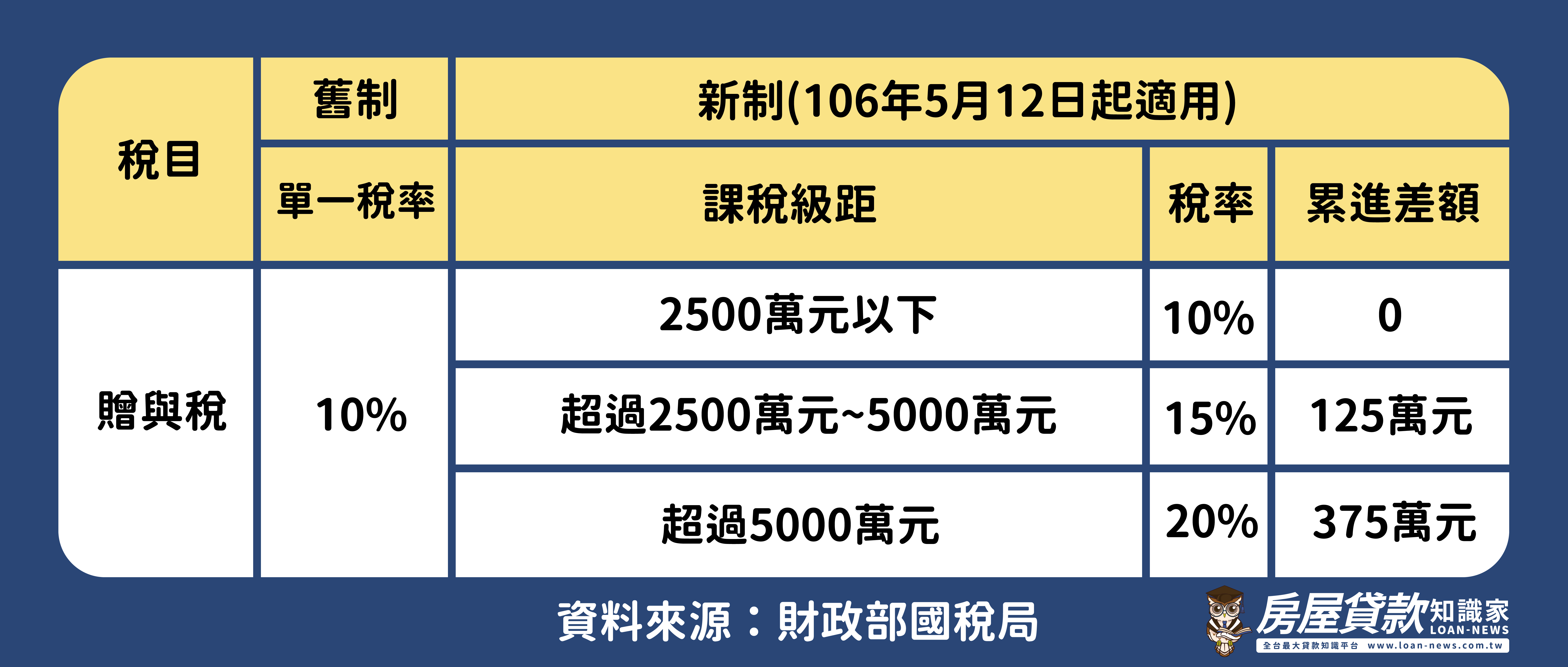 根據遺產及贈與稅法,目前贈與稅已由單一稅率 10%調整為累進稅率,最高 20%。