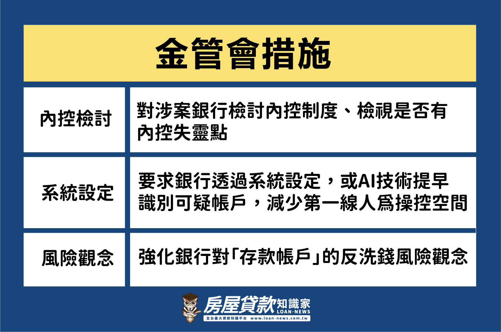 金管會對於近期爆發的銀行員涉及詐騙集團事件,推出幾個措施。將對涉案銀行進行內控制度檢討,提升內部監控水平,並檢視銀行的內控機制是否足夠健全,確保能夠及早發現和制止的不當行為。過系統設定或人工智慧提前識別可疑交易和帳戶,降低第一線人員操控的空間,以提高安全性。強化銀行對洗錢風險的認識,加強風險防範觀念。