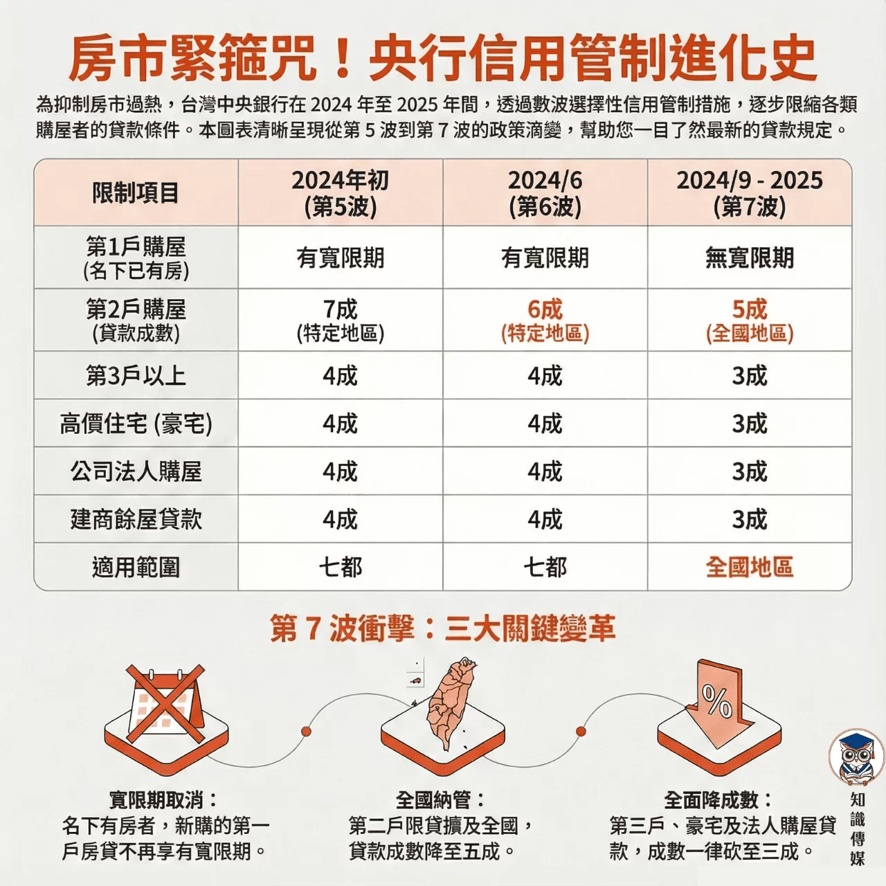 高價住宅(豪宅)與第三戶以上: 貸款成數上限降至 3 成,無寬限期。