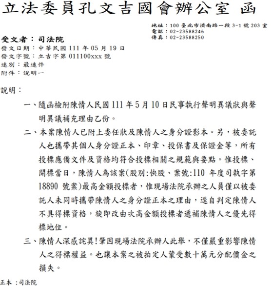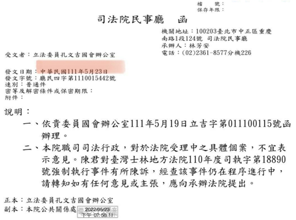經由社群內熱心群友的介紹,知識長幫忙COCO向孔文吉立委陳情此事,孔文吉立委國會辦公室也以最速件發函司法院,希望主管機關司法院能發表意見。可惜,司法院仍秉持一貫的官樣立場,表示不介入進行中的個案: