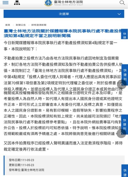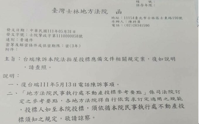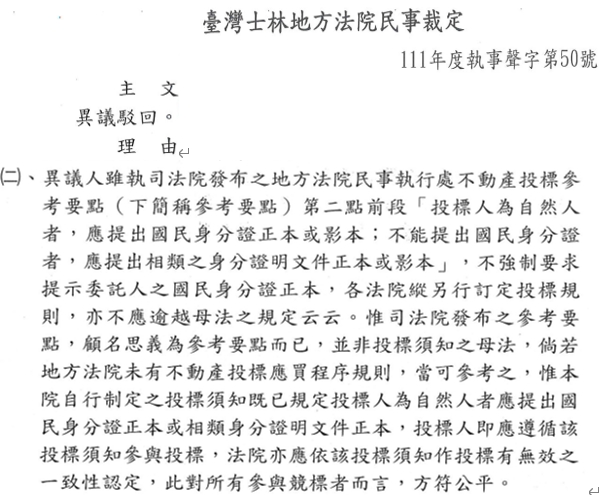由於COCO在代為投標前有先行至士林地院櫃檯詢問「受託投標是否一定要帶委託人之身分證正本?」,櫃檯人員告知COCO「攜帶委託人之身分證影本及自己的身分證正本就可以了」,可見士林地院內部的工作人員對其法院專屬的投標須知規定並不熟悉。用自身員工亦不熟悉的投標須知來要求初次前來投標的小民,甚至以此為由判定廢標,比例原則認定上是否失當?確實值得關注。不過,在這個途徑仍然只得到士林地院制式的回復: