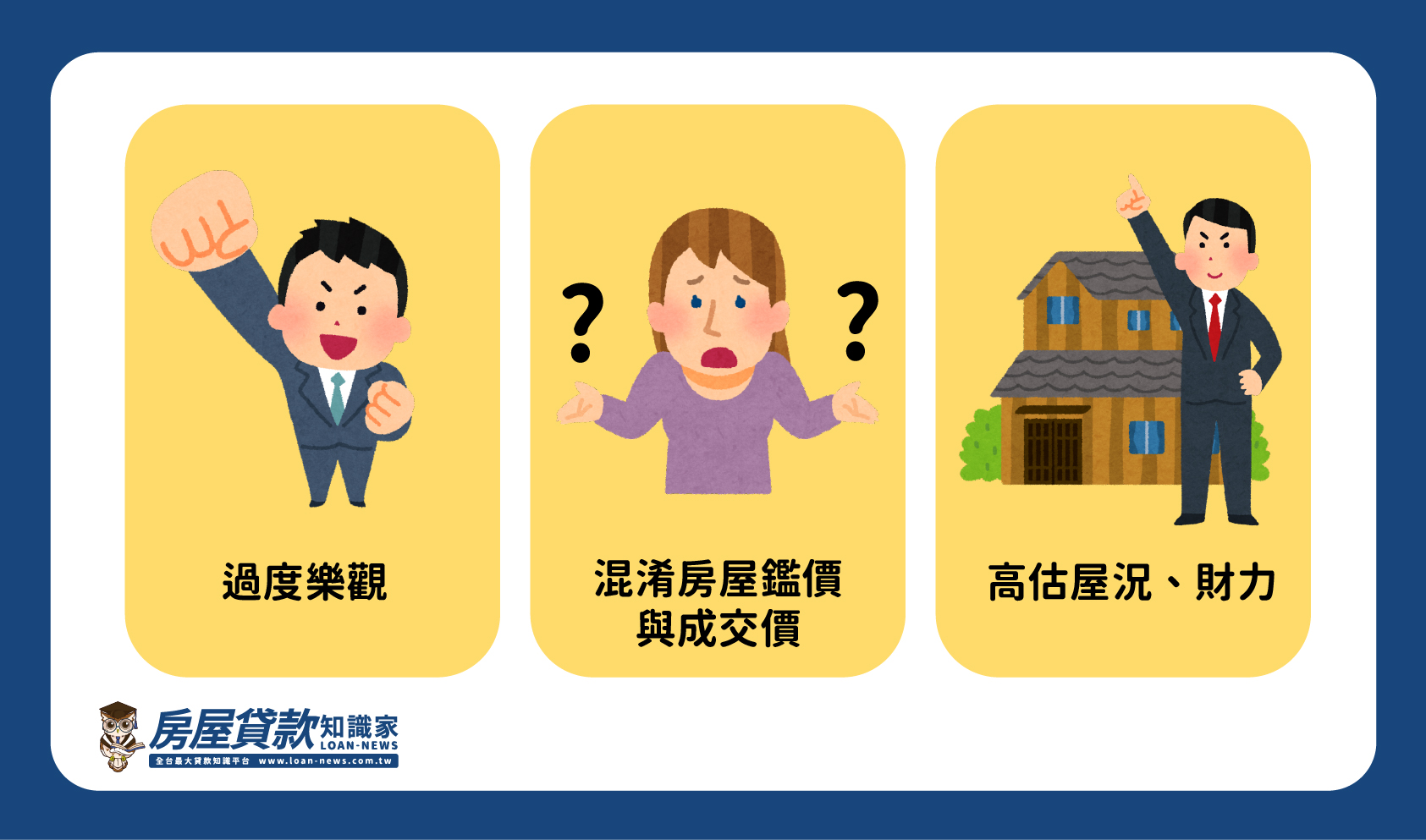 被賣家和房仲影響導致過度樂觀是最常見的原因,建議不要完全相信房仲和賣家的承諾或保證。而是直接向銀行諮詢貸款資訊,因為最終放貸的是銀行,而不是房仲或賣家。