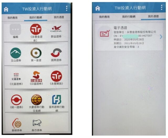 - 下載「TW投資人行動網」App後將App打開,將「我的行動網」中,增加選取往來的券商,依照各券商憑證申請流程申請至少一張憑證,申請完畢可以在「我的憑證」中看到該憑證