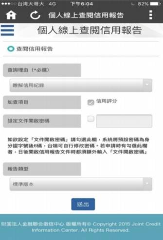 - 選擇查詢理由(*必選)及選擇是否加查信用評分。按下「送出」後,系統將自動判斷是否收費