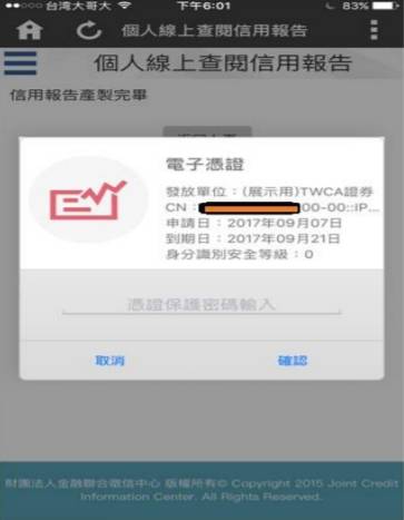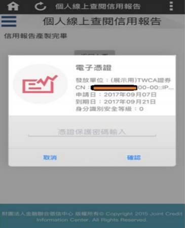 1.若為首次查閱(無須進入付費流程),系統自動產製加密之信用報告,再輸入憑證密碼
