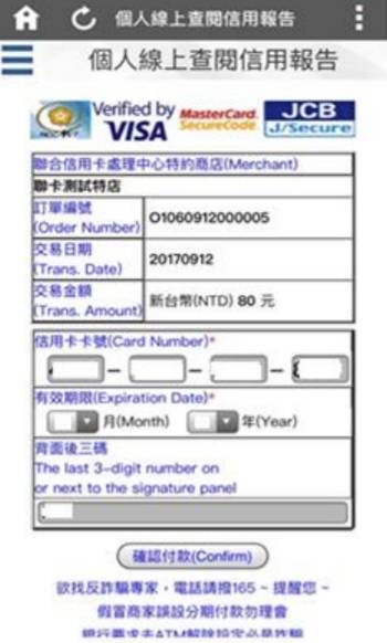 2.若為非首次(查閱進入付費流程),請先選擇電子發票開理方式(圖二),確認後按下前往付款進入信用卡刷卡頁面(圖三),填入正確的信用卡資料後按下確認付款,信用卡資料確認無誤後顯示付款成功(圖四),按下下一步可產生信用報告,再輸入憑證密碼(圖五)。