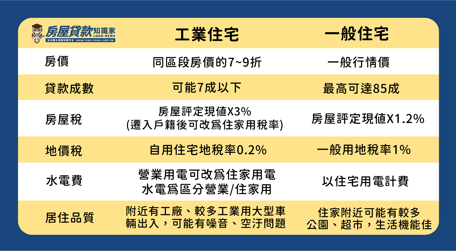 工業住宅和一般住宅在法規、使用特性和價格上有著明顯差異。由於工業用土地取得成本相對較低,通常售價為同區段房價的7~9折,但工業住宅的貸款成數較低,利率也較高,且不適用政府提供的房貸優惠,如新青安房貸、公教房貸等。