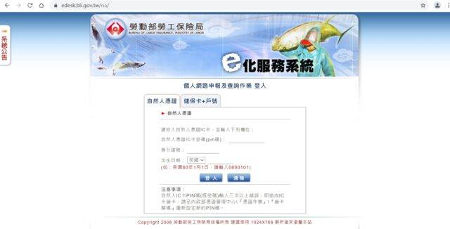 - 首先準備好讀卡機將憑證插入後,進入勞動部勞工保險局e化服務系統 → 連結 https://edesk.bli.gov.tw/na/