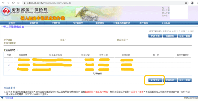 - 進入畫面後勞保明細就會跑出來,點選PDF下載,就完成囉