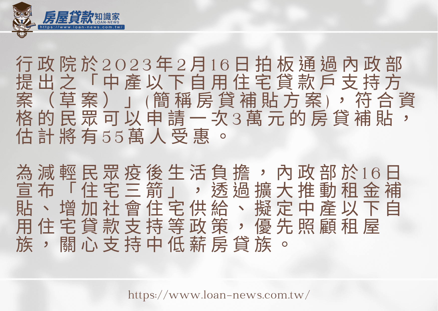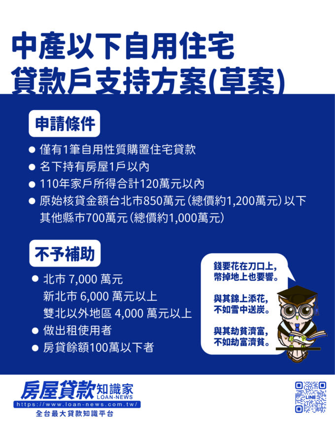 - 房產專家預估,由於受惠對象僅限「既有貸款戶」,新貸戶沒有補貼,該政策對市場買氣的影響有限。