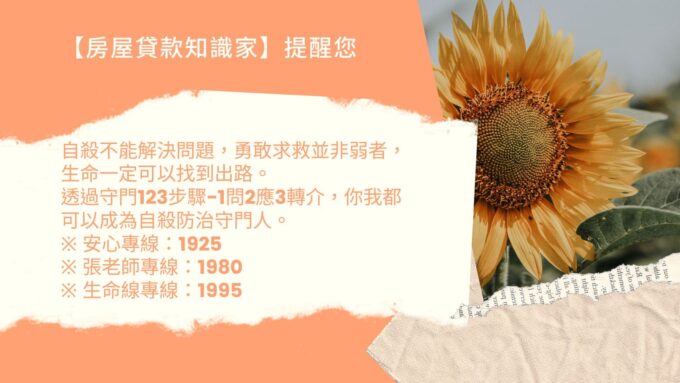事前的預防遠勝於事後的求償,建立友善的租賃關係才是身為房東的首要之務。如果有任何迷惘、難關,都歡迎透過「房屋貸款知識家」的社群尋求群友們的協助,輕生念頭是可以緩解的,給自己多點時間、空間,幫助自己脫離谷底,珍惜生命!知識長關心您!