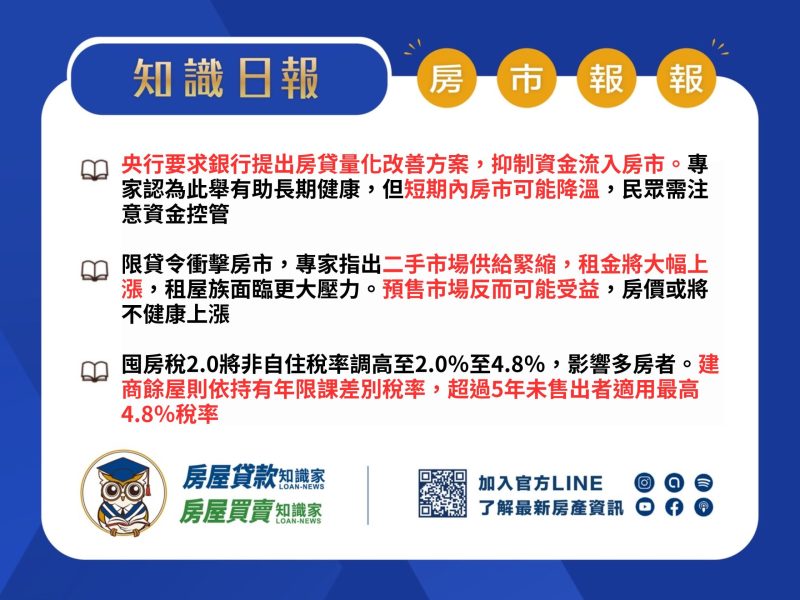 台灣央行要求銀行提出到 2025 年年底的自主管理不動產貸款具體量化改善方案,央行出重手,要避免資金持續流入不動產市場,進而讓房市降溫。