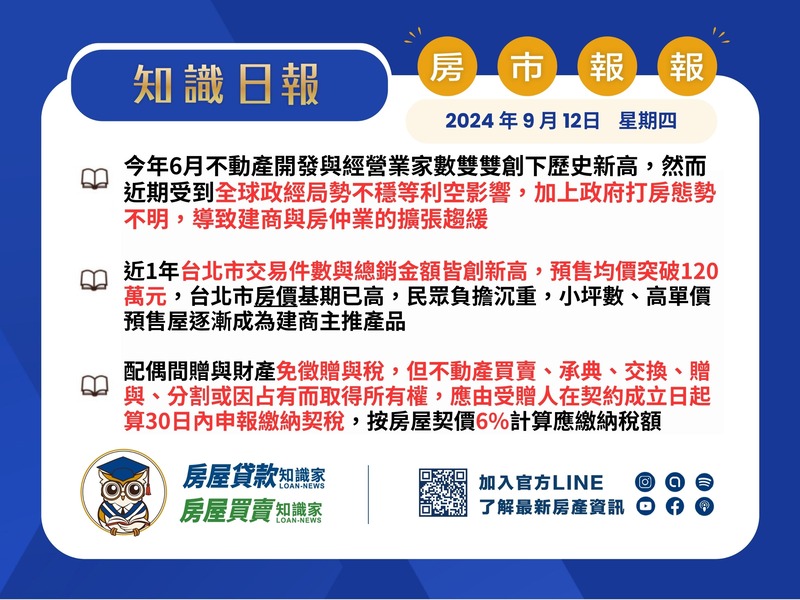 然而,近期全球政經局勢不穩,政府的打房政策也還不明確,影響了市場的預期。2024年上半年,建商與房仲的擴張腳步顯著放慢,與去年同期相比,2024年6月不動產開發業家數僅增長2.8%,經營業家數則僅增長3.2%,是5年來最低的增幅紀錄……《詳全文:https://loan-news.com/tax-240912/》