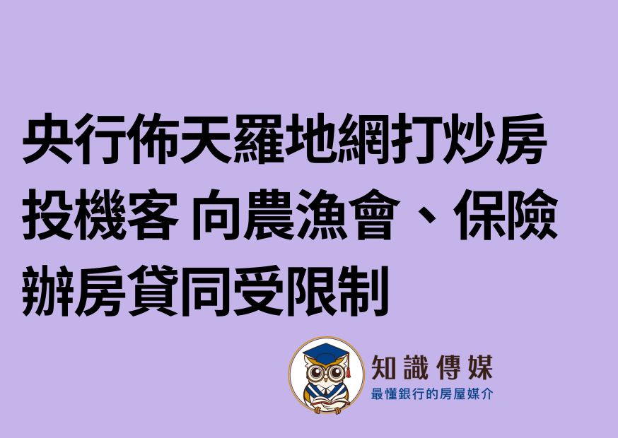 央行第七波房市信用管制來得又急又快,政策重拳出擊下讓市場亂成一團,坊間盛傳名下有房者可找農漁會等不受銀行法72-2限制的金融機構申請貸款,但據央行公開資料,開宗明義就是第七波房市信用管制對象包含「農漁會」、「郵局」、「保險公司」,名下有房者申貸都受影響。