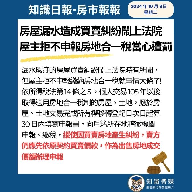 房屋漏水造成買賣糾紛鬧上法院 屋主拒不申報房地合一稅當心遭罰