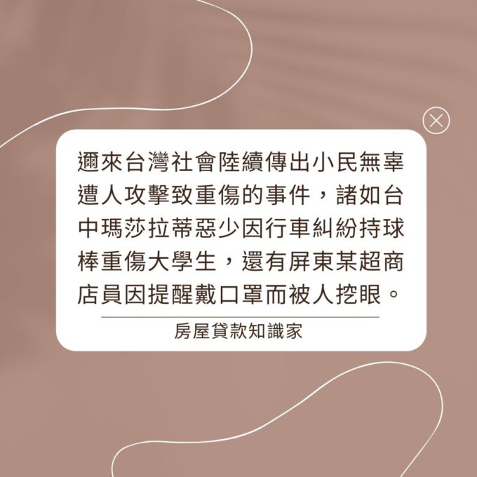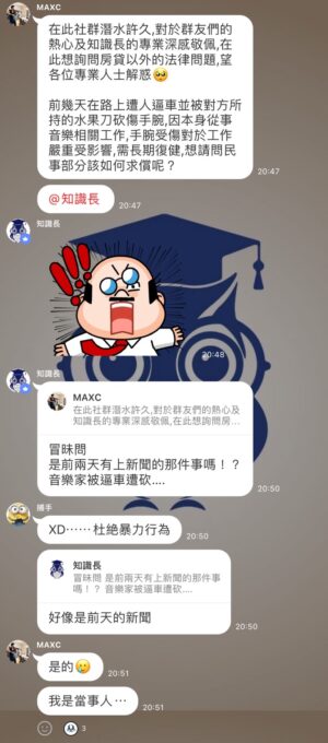 日前有一則,知名陳姓音樂家因開車按喇叭提醒違規變換車道的白色休旅車,而被二度惡意逼車並遭砍斷左手40%肌肉的恐怖新聞。因陳姓音樂家正好是Line社群-「房屋貸款知識家」上的群友,在群上提出諮詢協助而引起一陣波瀾,讓原本單純討論房屋貸款知識的社群瞬間變成社會議題討論版。許多群友們第一次深刻的感受到自己原來離危險這麼近,身邊居然就有人硬生生的被莫名砍殺濺血,造成嚴重傷害。