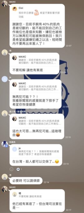 事後警方迅速追緝到嫌犯,全案除朝強制、傷害等罪嫌偵辦外,警方也將依《道路交通管理處罰條例》對嫌犯危險駕駛行為開出罰單,並吊扣汽車牌照。據陳姓音樂家的驗傷結果,被砍傷的部位有極高機率傷及手部重要結構(如肌腱、神經及動脈),影響手部功能,足見犯嫌下手之狠,實已達到刑法第278條重傷害罪之犯罪故意。而陳姓群友為職業小提琴家,雙手的重要性遠高於一般人,除了手部受重傷的治療、復健等醫療費用得依民法侵權行為的規定,全額向加害者求償外,如果之後因此影響工作能力,還可以依民法第193條請求加害者就減損的部分負損害賠償責任。另外,陳姓群友所遭受的驚嚇、害怕,甚至對未來生活產生的不安、恐懼等精神創傷,也可以依民法第195條向加害者請求精神慰撫金,這些民事賠償經法院判決確定後,如果加害者繼續白爛耍賴,受害者可以持確定判決請求法院強制執行,查封加害者的財產或扣押其薪資。