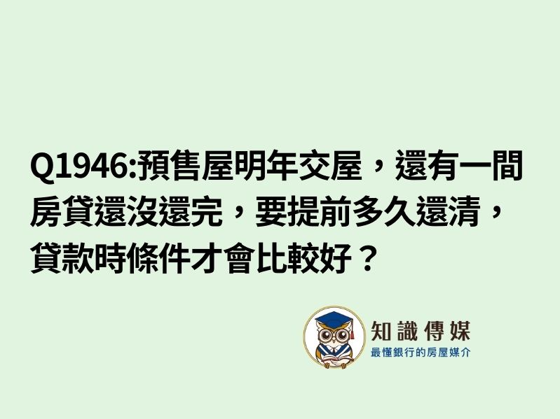 <span style="font-size: 14pt;">(1) 目前有一間預售預計明年交屋,本人名下還有一間掛一的房貸還沒還完,</span><span style="font-size: 14pt;">請問要提前多久還清預售在交屋要貸款時候條件會比較好?</span> <span style="color: #008080;"><span style="font-size: 14pt;">A:</span><span style="font-size: 14pt;">半年以前是最好的</span></span> <span style="font-size: 14pt;"><a href="https://lin.ee/iSWCzoj" target="_blank" rel="noopener"><img class="aligncenter size-full wp-image-19971" src="https://loan-news.com.tw/storage/2023/08/3.jpg" sizes="(max-width: 1576px) 100vw, 1576px" srcset="https://loan-news.com.tw/storage/2023/08/3.jpg 1576w, https://loan-news.com.tw/storage/2023/08/3-300x53.jpg 300w, https://loan-news.com.tw/storage/2023/08/3-1024x183.jpg 1024w, https://loan-news.com.tw/storage/2023/08/3-150x27.jpg 150w, https://loan-news.com.tw/storage/2023/08/3-768x137.jpg 768w, https://loan-news.com.tw/storage/2023/08/3-1536x274.jpg 1536w, https://loan-news.com.tw/storage/2023/08/3-260x46.jpg 260w, https://loan-news.com.tw/storage/2023/08/3-750x134.jpg 750w, https://loan-news.com.tw/storage/2023/08/3-1140x203.jpg 1140w" alt="" width="1576" height="281" data-pin-no-hover="true" /></a>點我諮詢知識長 <img class="emoji" role="img" draggable="false" src="https://s.w.org/images/core/emoji/15.0.3/svg/1f600.svg" alt="😀" /> <a href="https://lin.ee/iSWCzoj" target="_blank" rel="noopener">https://lin.ee/iSWCzoj</a></span>
