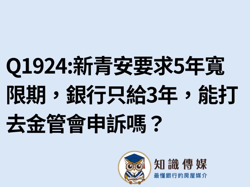 <span style="font-size: 14pt;">(1) 請問新青安若是要求5年寬限期,但銀行只願意給3年,能打去金管會申訴嗎?</span> <span style="font-size: 14pt; color: #008080;">A1:不行。沒有用,因為給多少寬限期的權限在於央行</span> <span style="font-size: 14pt;"><a href="https://lin.ee/iSWCzoj" target="_blank" rel="noopener"><img class="aligncenter size-full wp-image-19971" src="https://loan-news.com.tw/storage/2023/08/3.jpg" sizes="(max-width: 1576px) 100vw, 1576px" srcset="https://loan-news.com.tw/storage/2023/08/3.jpg 1576w, https://loan-news.com.tw/storage/2023/08/3-300x53.jpg 300w, https://loan-news.com.tw/storage/2023/08/3-1024x183.jpg 1024w, https://loan-news.com.tw/storage/2023/08/3-150x27.jpg 150w, https://loan-news.com.tw/storage/2023/08/3-768x137.jpg 768w, https://loan-news.com.tw/storage/2023/08/3-1536x274.jpg 1536w, https://loan-news.com.tw/storage/2023/08/3-260x46.jpg 260w, https://loan-news.com.tw/storage/2023/08/3-750x134.jpg 750w, https://loan-news.com.tw/storage/2023/08/3-1140x203.jpg 1140w" alt="" width="1576" height="281" data-pin-no-hover="true" /></a>點我諮詢知識長 <img class="emoji" role="img" draggable="false" src="https://s.w.org/images/core/emoji/15.0.3/svg/1f600.svg" alt="😀" data-pin-no-hover="true" /> <a href="https://lin.ee/iSWCzoj" target="_blank" rel="noopener">https://lin.ee/iSWCzoj</a></span>
