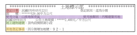 其他登記事項:如果此欄位有預告登記、假扣押、假執行、假處分及查封及禁止處分等限制登記資料時,表示這宗土地已被依法限制並禁止辦理移轉過戶登記,也不能設定他項權利,而這些資訊在所有權狀上是看不出來的。