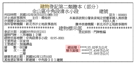 層次面積、總面積:假設建物為獨棟式或二層以上時,層次面積則會分別列出每一層別的面積,而總面積則是這些層次面積的加總,但總面積不代表該建號面積的總和。坊間所謂的銷售面積通常是指「層次總面積」、「各附屬建物面積(例 如陽台、雨遮)」、「公設面積」的總和。