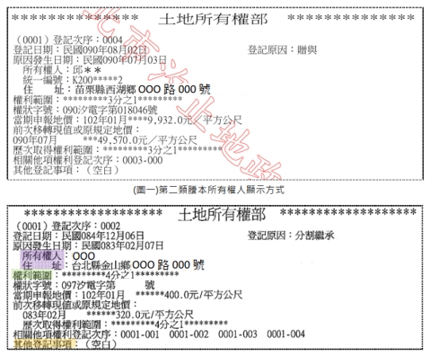 所有權人及住址:記載所有權人辦理登記當時的姓名及戶籍地址。原則上地政機關是無法依所有權人的要求登載通訊地址的。若申請第二類謄本時,權利人的部分姓名、出生日期及部分統一編號即自動隱匿(如下圖一),以保護當事人的個人資料。利害關係人則可申請第三類謄本取得完整姓名、完整住址之資料(如下圖二)。