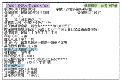 債務人及債務額比例、設定義務人:一般來說債務人即為設定義務人,也就是所有權人,若兩者不同表示所有權人將此不動產供他人抵押貸款。例如父母親提供房子給兒女向銀行借錢去作生意,此時父母是設定義務人,兒女即為債務人。