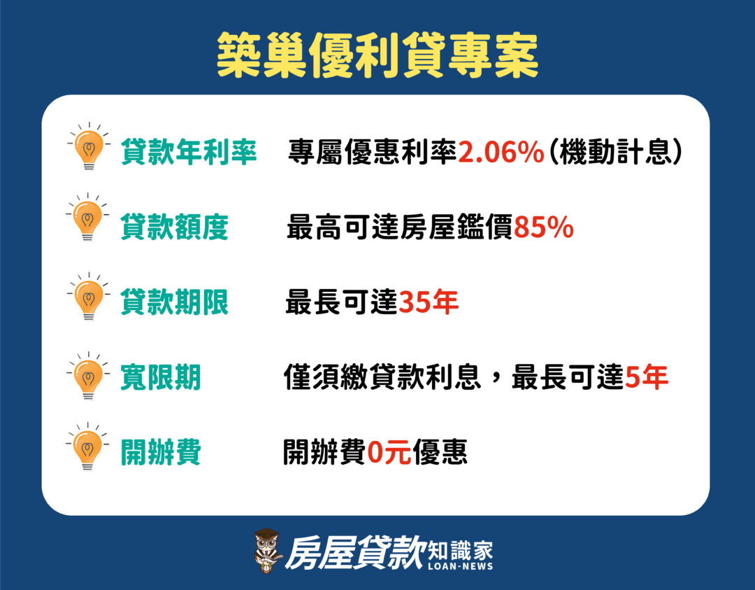 「築巢優利貸」專案特點為利率直接以地板價承作、免收開辦費、免收提前清償違約金優惠,申辦者本人或其配偶或與他人共購之不動產亦適用,由於公教人員是鐵飯碗,銀行逾放風險也較低,因此專屬於「築巢優利貸」的優惠條件也優於一般的房屋貸款。