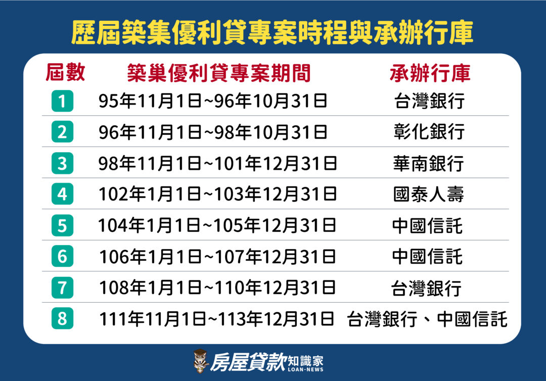 ※下表為歷屆築巢優利貸專案時程與承辦行庫