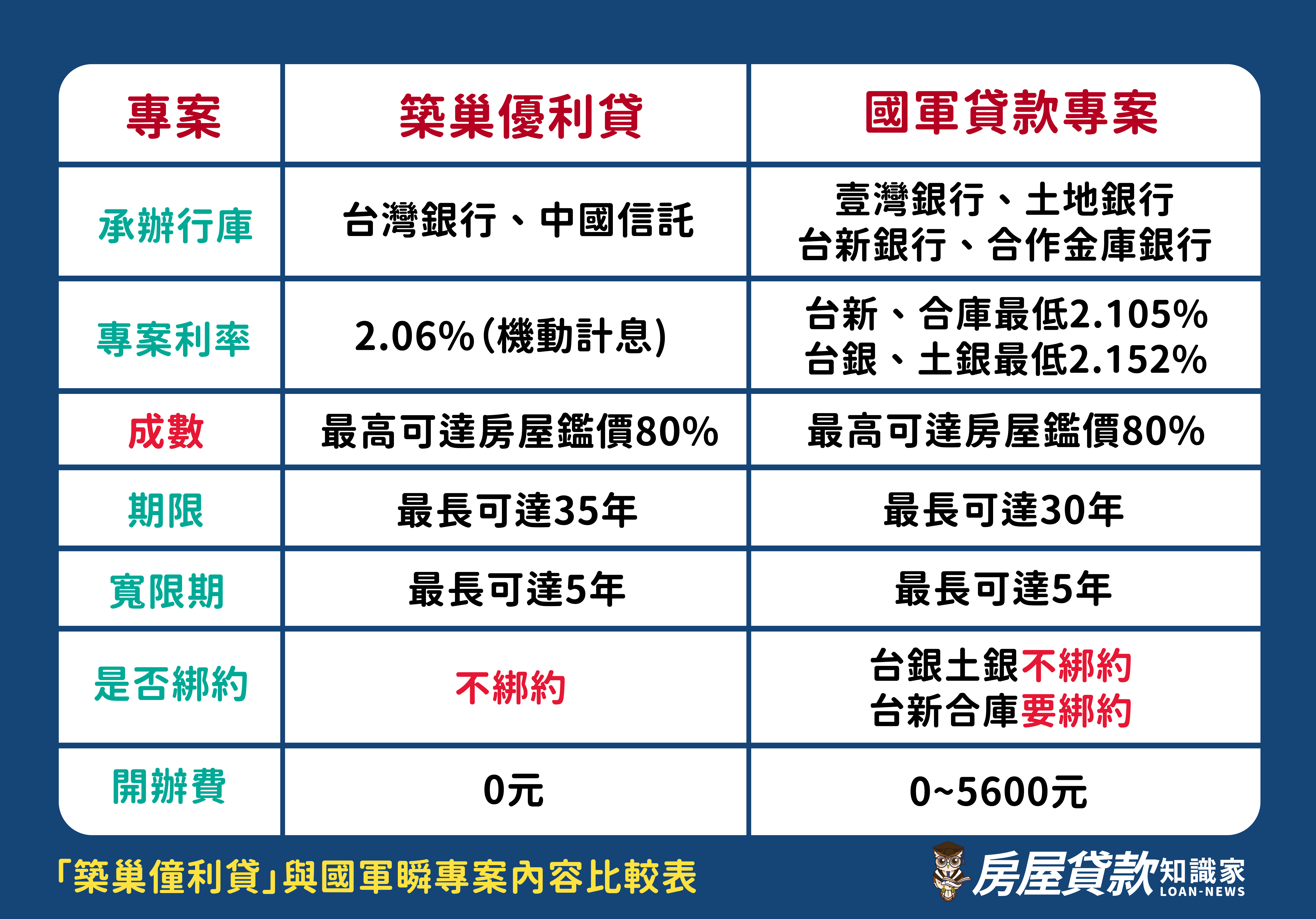 雖然目前的國軍貸款優惠方案,已經享有較低於一般民眾的利率優惠,但即便是最低利率2.105%也比築巢優利貸優惠利率2.06%還高,而其他項目,例如貸款期限、成數、綁約期間、開辦費等條件也劣於於築巢優利貸。