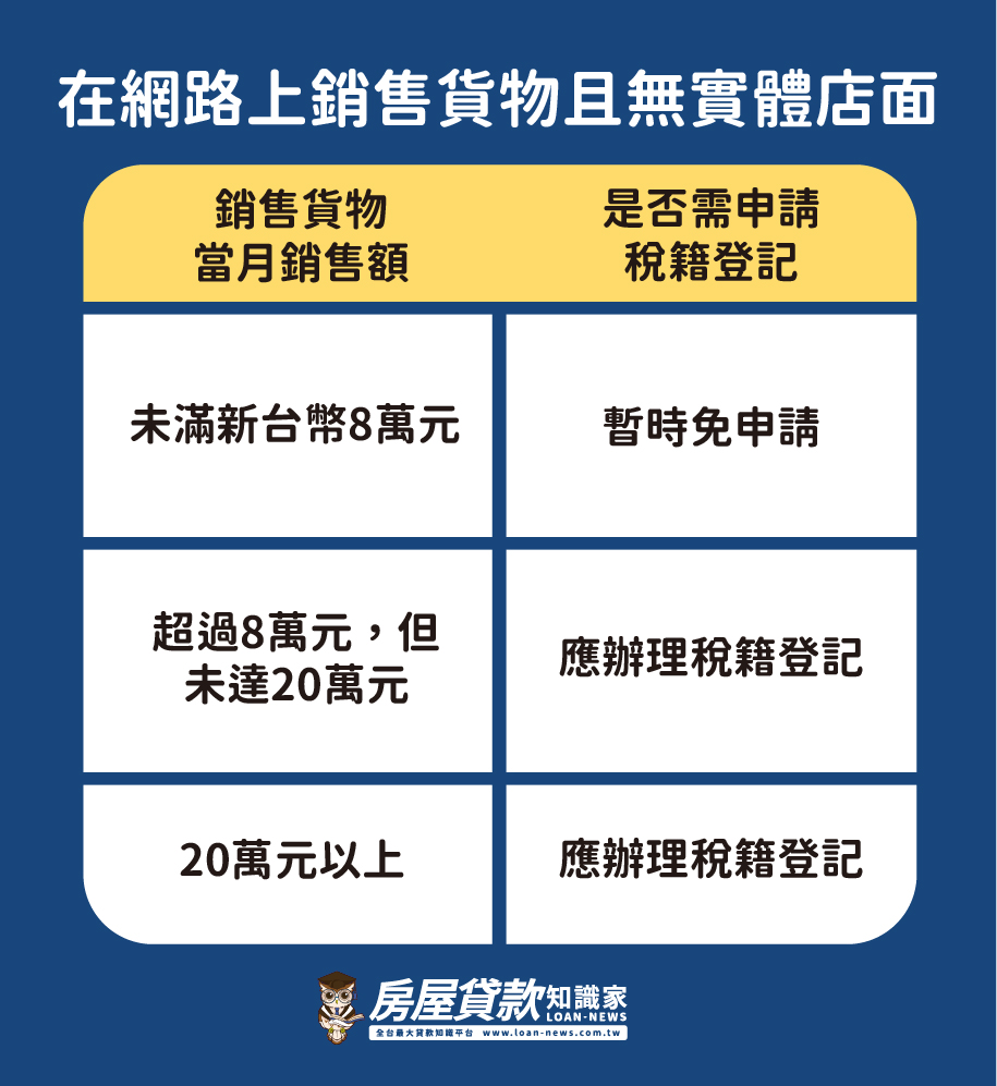 根據財政部的營業登記(稅籍登記)規定,凡有營業事實者就須進行營業登記,需向主管稽徵機關繳納營業稅,也因此「營業登記」等同於「稅籍登記」。但對於興新行業則有不同的規範。例如,僅在網路上銷售且無實體店面者,若月銷售額未滿8萬元時,可以暫時免申請。