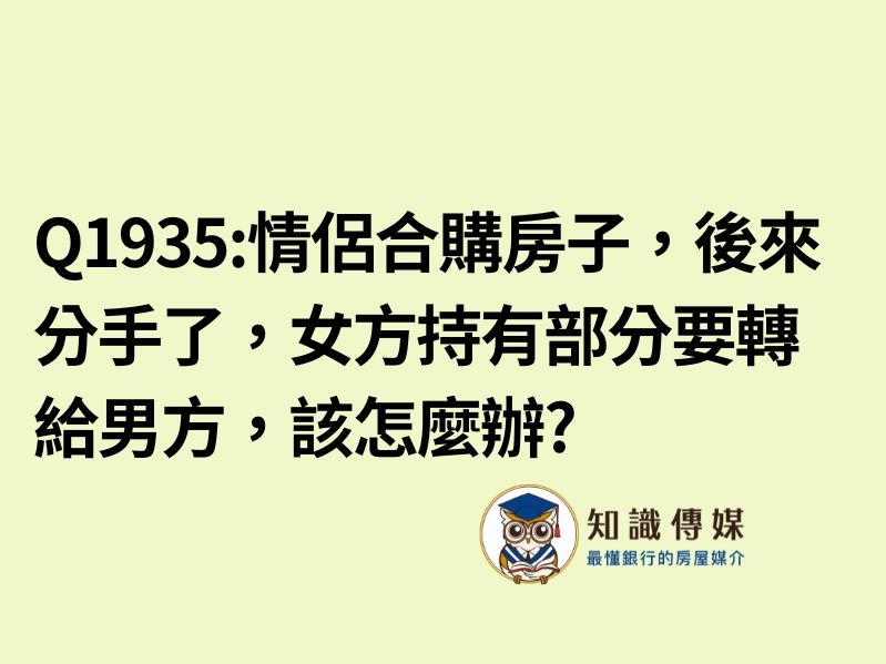 (1) 請問男女朋友合購,頭期男方支出,主借人也是男方,保人則是女方,房屋雙方共有,但現在關係出問題,女方持有部分要轉移給男方,請問這樣該怎麼辦?