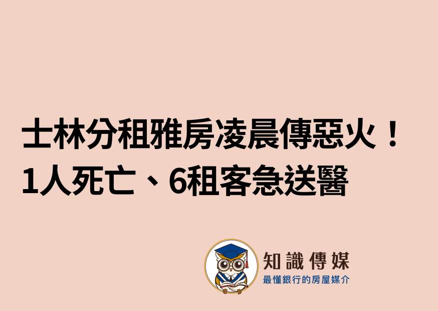 台北市士林區延平北路八段一棟巷內出租雅房今(7日)凌晨發生火警,警方凌晨接獲報案後,隨即到場救援。據了解,該雅房出租給9個人居住,其中有8位民眾被救出,共有6人送醫,不過其中一名42歲男性租客被救出已無生命跡象,送醫後仍宣告不治……《詳全文:http://sky/house/story/14737》