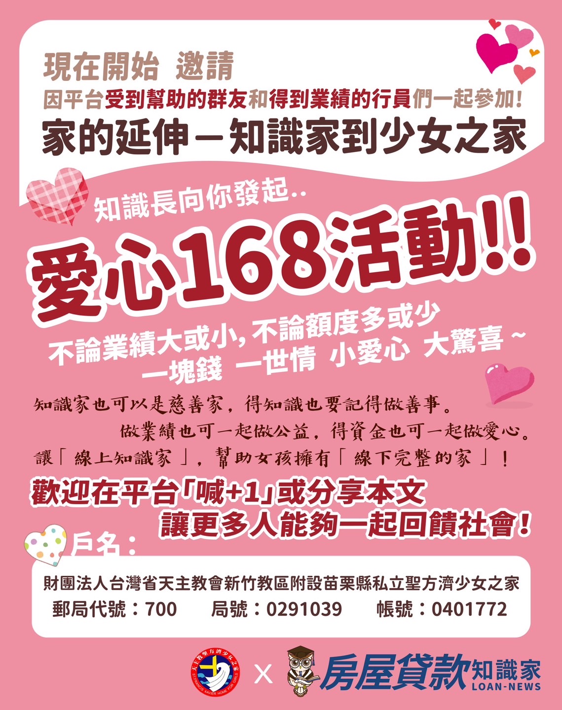 「房屋貸款知識家」創立以來,締結了不少業績、良緣,也實質上幫助許多朋友。雖然協助上千人成家,但在苗栗清華里的「聖方濟少女之家」,一群求學中的女孩,還在尋覓1個共築壁壘的「家」。「家」在古時,有「豕」者恆富、有「宀」共築壁壘;聖方濟協助家的根基,讓女孩無畏生活費、不用隻身闖蕩。