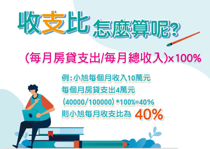收支比:每個月房貸繳納金額佔總收入的百分比, 民眾能評估自己需要多少自備款及償還能力,也是銀行能評估申貸人房貸最高可貸成數的參考數據之一。一般來說,銀行普遍可以接受收支比落在百分之六十~七十區間,確保申貸人再支出房貸後還能生活, 而收支比越低,可以取得的貸款條件就會越好。