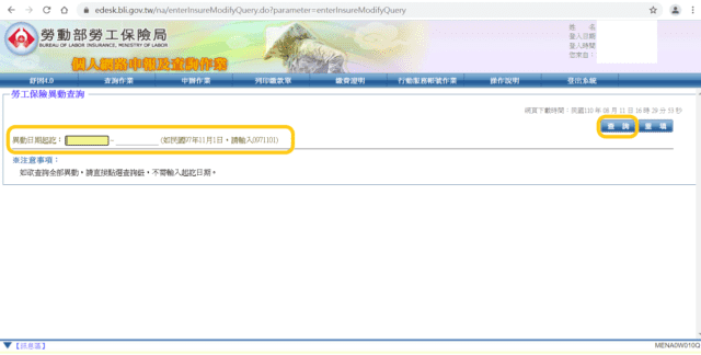 - 進入畫面後,點選查詢作業>異動查詢>勞工保險異動