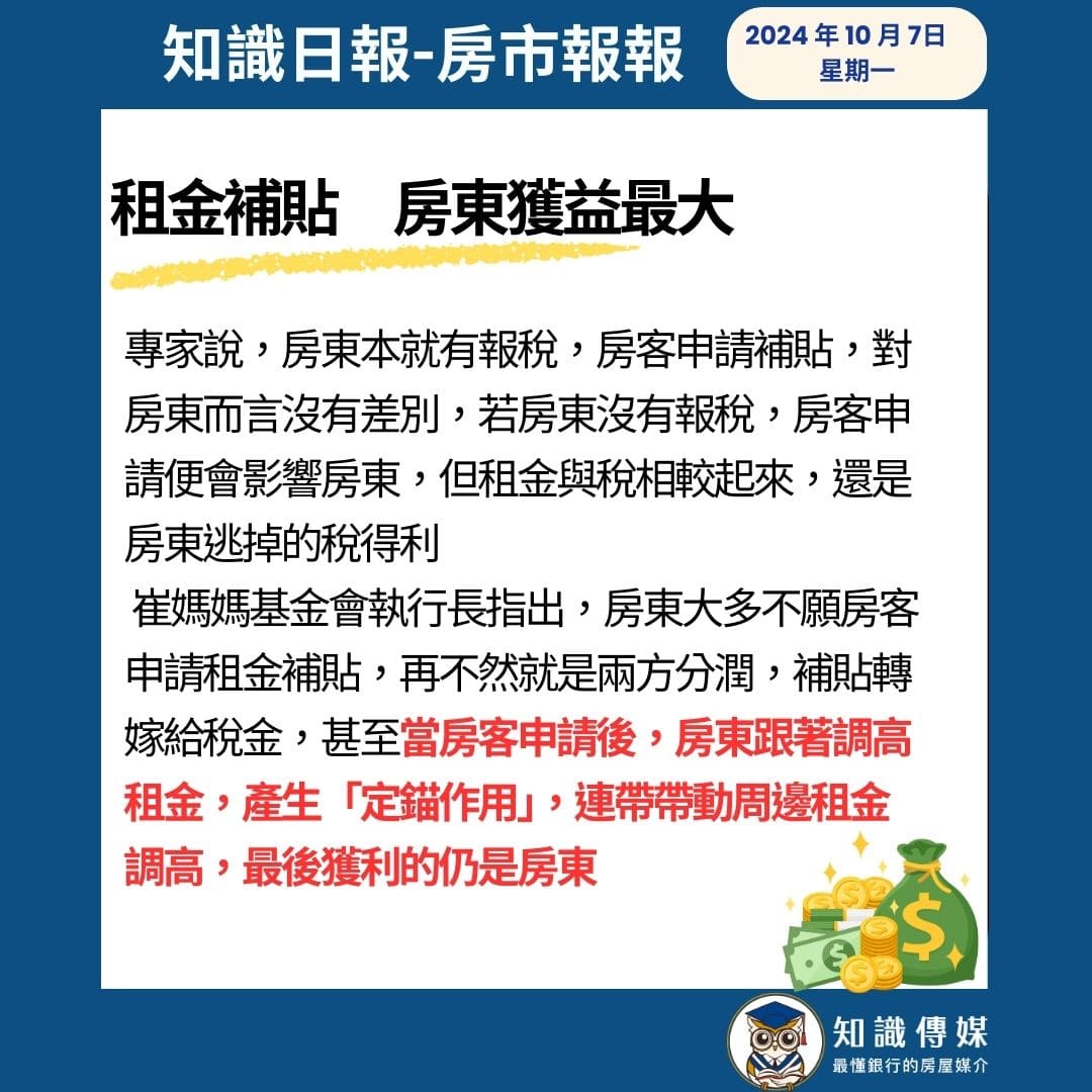 政府推動「300億元中央擴大租金補貼專案計畫」,租金補貼從50萬戶擴大至75萬戶。對於租金補貼到底誰受惠,專家正反意見不一,有人認為對小資族來說是「不無小補」,但崔媽媽基金會指出,租金補貼帶動「定錨作用」,不過兩方意見均認為最後受惠的仍是房東。