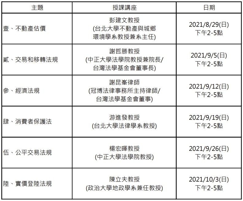 <span style="font-size: 14pt;">不動產交易法規課程開始報名囉!歡迎踴躍報名參加 ☟</span> <span class="highlight" style="background-color: #666666; font-size: 14pt;">課程資訊</span> <span style="font-size: 14pt;"><img class="alignnone wp-image-3238" src="https://www.loan-news.com.tw/storage/2021/08/1627977489704.jpg" alt="" width="640" height="528" /></span> <span style="font-size: 14pt;">上課地點:視訊上課,若疫情降至二級則改成視訊及實體上課同時並行</span> <hr /> <span class="highlight" style="background-color: #666666; font-size: 14pt;">報名資訊</span> <ol> <li><span style="font-size: 14pt;">採線上報名:一次完成六堂課線上報名</span></li> <li><span style="font-size: 14pt;">報名及繳費期限至8/18截止</span></li> <li><span style="font-size: 14pt;">繳費人數達30人以上即開班</span></li> </ol> <hr /> <span class="highlight" style="background-color: #666666; font-size: 14pt;">報名及匯款資訊連結</span> <span style="font-size: 14pt;">☞ <span style="color: #3366ff;"><a style="color: #3366ff;" href="https://reurl.cc/83ZAeR">https://reurl.cc/83ZAeR</a></span></span> <hr /> <span class="highlight" style="background-color: #666666; font-size: 14pt;">主辦單位</span> <span style="font-size: 14pt;">財團法人台灣法學基金會</span>