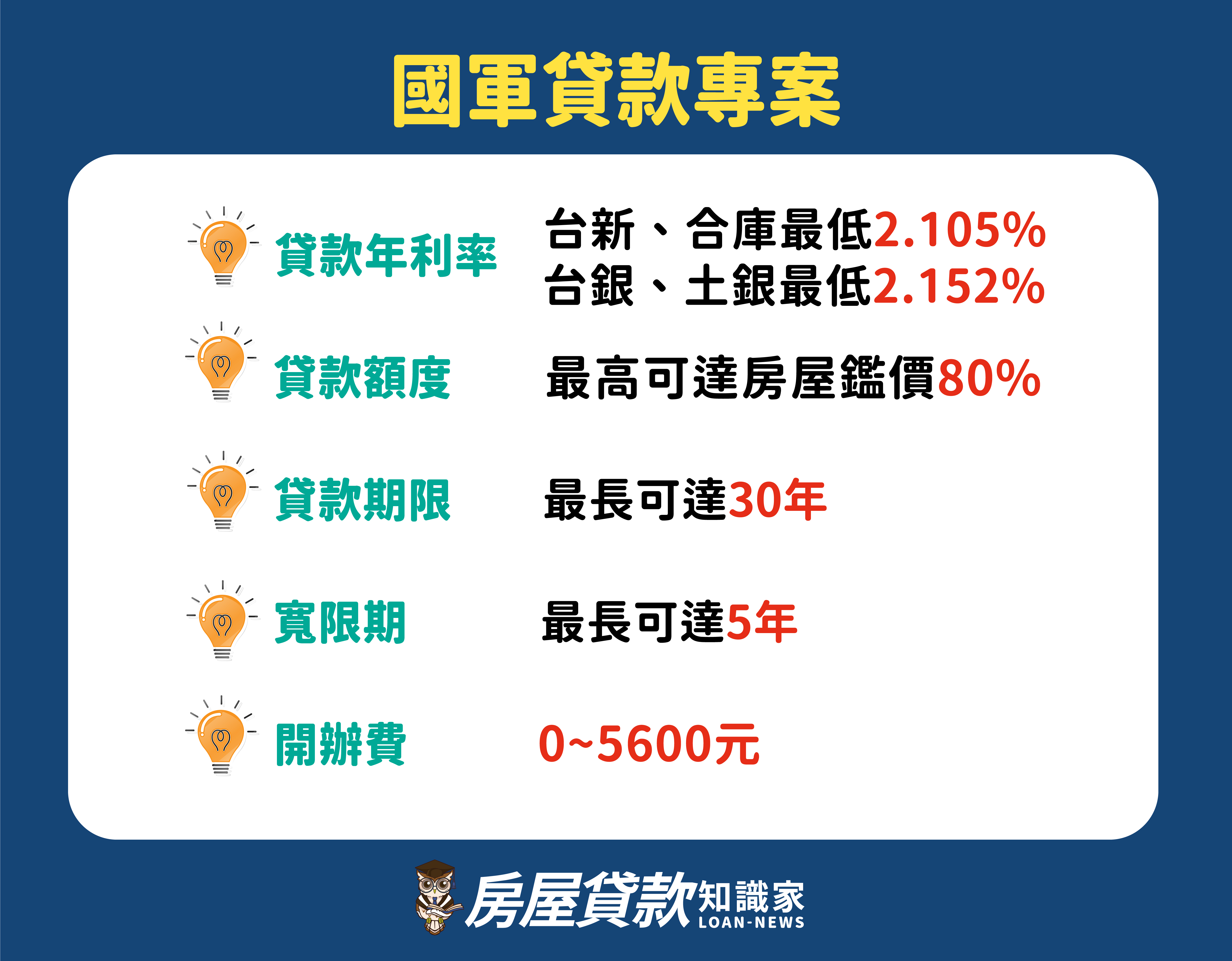 雖然目前的國軍貸款優惠方案,已經享有較低於一般民眾的利率優惠,但即便是最低利率2.105%也比築巢優利貸優惠利率2.06%還高,而其他項目,例如貸款期限、成數、綁約期間、開辦費等條件也劣於於築巢優利貸。