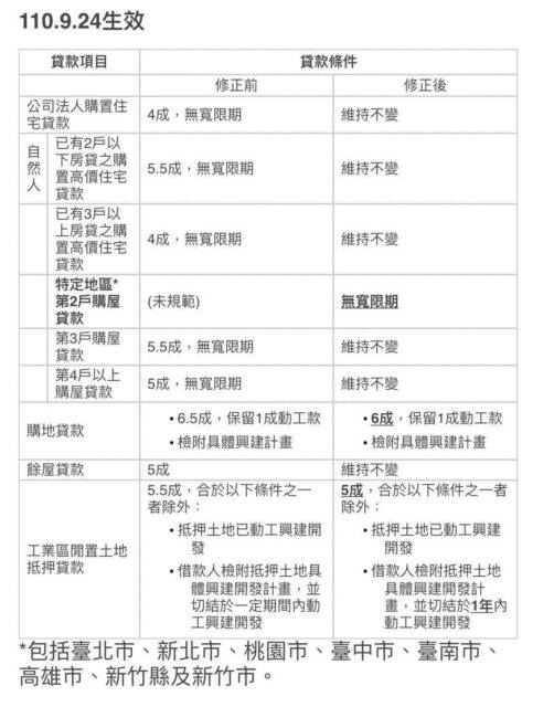 <h4>央行23日召開第三季理監事聯席會議,宣布修正「中央銀行對金融機構辦理不動產抵押貸款業務規定」,修正要點包括:24日起</h4> <h4>一、自然人特定地區第2戶購屋貸款不得有寬限期</h4> <h4>二、調降購地貸款最高成數為6成</h4> <h4>三、調降工業區閒置土地抵押貸款最高成數為5成,並明定工業區閒置土地抵押貸款規範措施除外條款之「一定期間」為1年。另外也宣布政策利率將連續6季不調整,維持在1.125%歷史低檔。</h4> <h4>*補充:特定區域為台北市、新北市、桃園市、台中市、台南市、高雄市、新竹縣及新竹市。央行業務局局長潘榮耀表示依據聯徵中心資料,發現今年6月底,有二筆房貸的自然人且坐落在此次規範 8 縣市的比重高達 82.6%。</h4> <h4>不曉得大家有沒有發現,許多銀行在今日不約而同調升自然人特定地區第2戶購屋貸款的利率,最低不得低於1.72%,經知識家致電詢問央行得知,央行並無<span style="color: #ff0000;">"明文及硬性規定"</span>特定地區購置第2戶最低利率的明確數字,但央行表示已與各間銀行"道德勸說"及"協調溝通"自然人特定地區第2戶購屋貸款利率的最低門檻。</h4> <h4><img class="aligncenter wp-image-5920 size-full" src="https://www.loan-news.com.tw/storage/2021/09/153330-e1632473086181.jpg" alt="" width="502" height="640" /></h4> <h4>提供換屋族變通方式,若之後想換屋,可先將第一間房屋售出之後,與銀行協調第二間降低利率或提供寬限期,但每間銀行不同,建議屆時詢問授信規範較準確。</h4> <h4></h4> <h4>點我諮詢知識長 ✉️ <a href="https://lin.ee/iSWCzoj">https://lin.ee/iSWCzoj</a></h4> <h4></h4>
